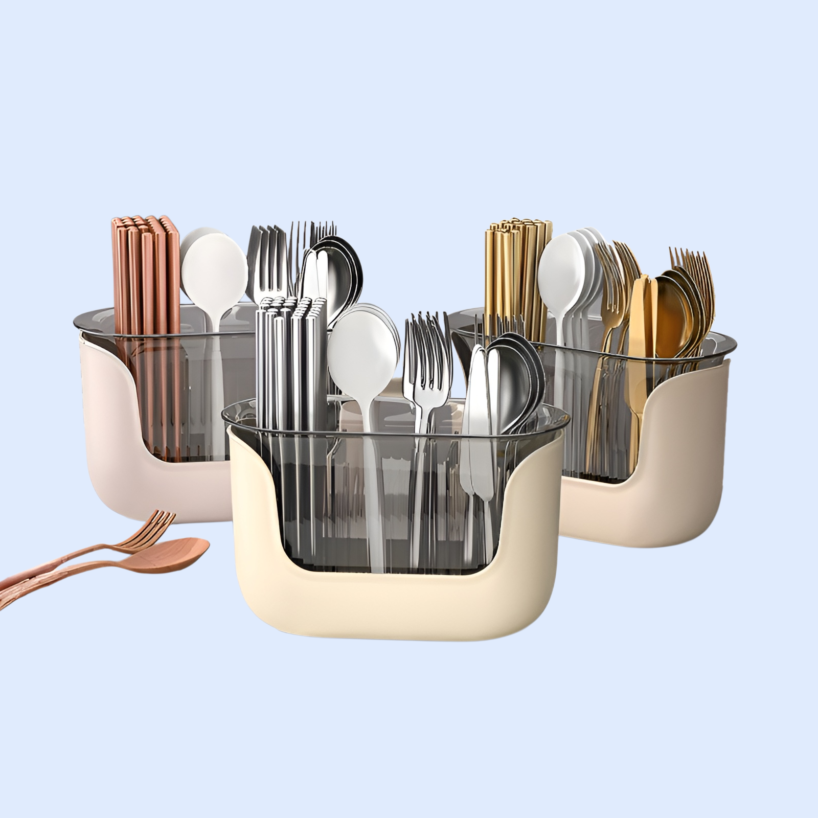仕切り付きの箸筒収納ボックスで、キッチンカウンターの整理整頓に最適。スプーンや箸など食器を水切りしながら収納可能。