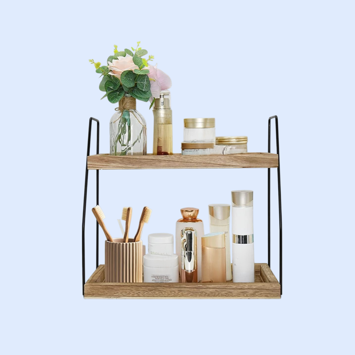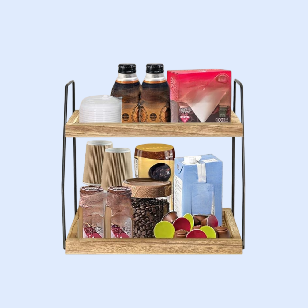 省スペース設計の二重層バスルーム収納ラック。キッチンやデスクトップにも最適、調味料や小物の整理に便利。耐久性と安定性を兼備。
