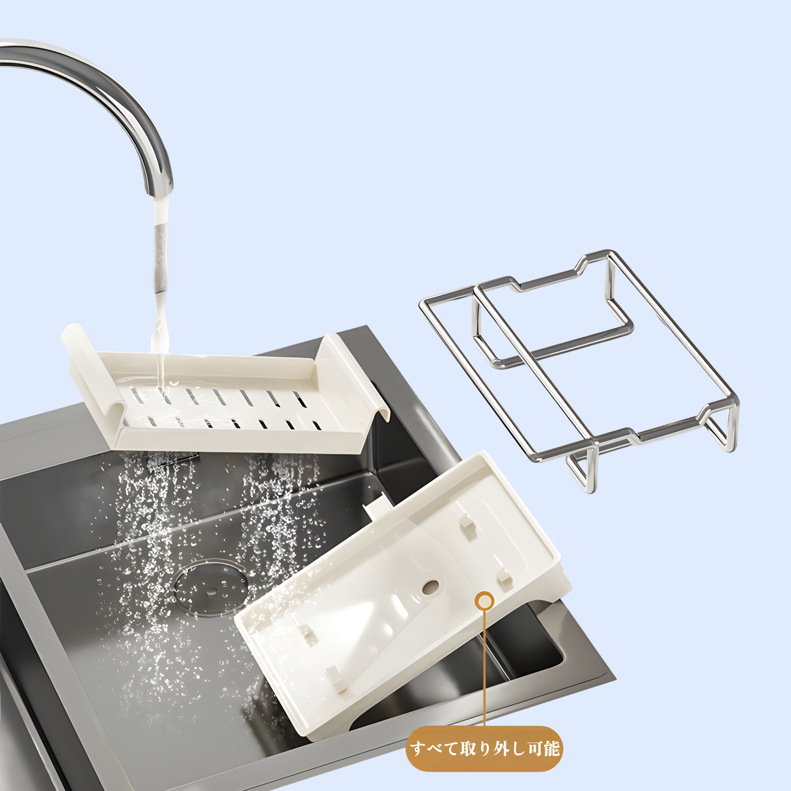 ステンレス製キッチン収納ラックは、排水機能付きで雑巾や食器、備品の整理に最適。蛇口やシンク周りにも設置でき、衛生的で耐久性に優れています。